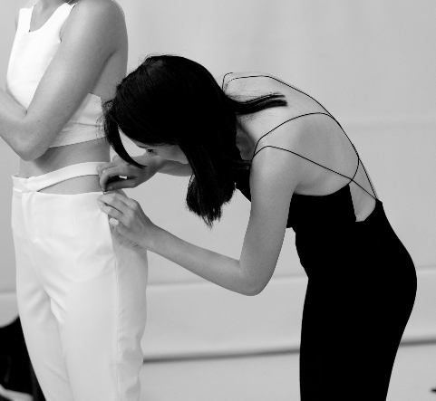 ‘Als ik het thema en het verhaal helder heb, start ik met het ontwerpproces. In mijn schetsen probeer ik al rekening te houden met ontwerpen die zowel in de winter als in de zomer gedragen kunnen worden, afhankelijk van hoe je de items combineert. Ik presenteer daarom één collectie per jaar, om de overproductie van collecties tegen te gaan. Het is altijd een ready-to-wearcollectie. Dat is al één aspect waarop ik let bij duurzaam ontwerpen.