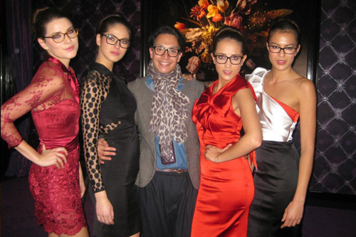 Dit is de officiële campagneposter van Karen Millen voor Specsavers.De modellen en gastvrouwen van de avond. Ze zien er alle vier fantastisch uit in deze mooie Karen Millen jurkjes.Een close-up van dit mooie montuurtje geshowd door Benelux Next Top Model Melissa.Even poseren. Personal shopper Bodo Breg en de modellen.Mindy met een montuurtje van Karen Millen